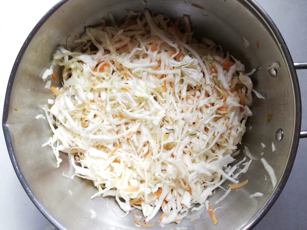 - 1 large cabbage, core removed and finely sliced (keep the outer leaves aside to use as fermenting weights)